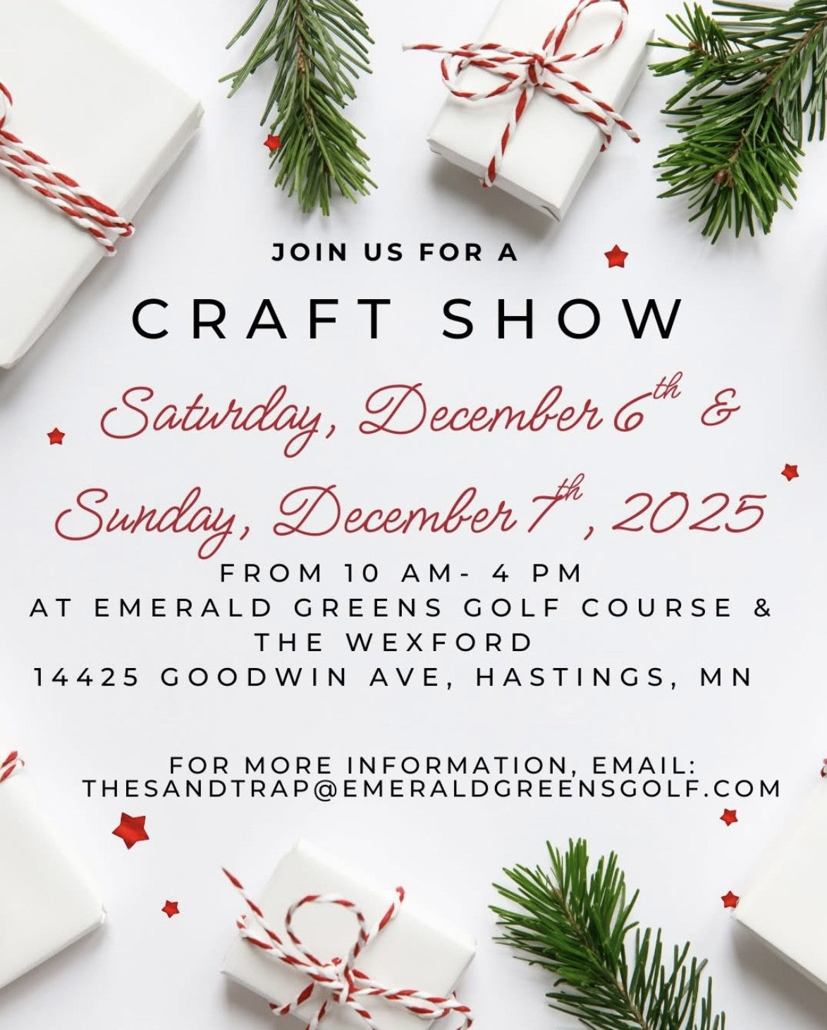Join us at the holiday craft show on Sunday, December 7th from 10 AM - 4 PM at Emerald Greens Golf Course & The Wexford in Hastings, MN (14425 Goodwin Ave).